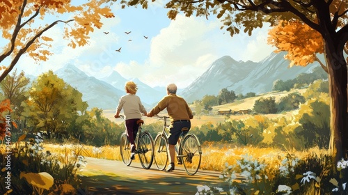 Obraz premium Elderly couple cycling through autumn landscape with mountains