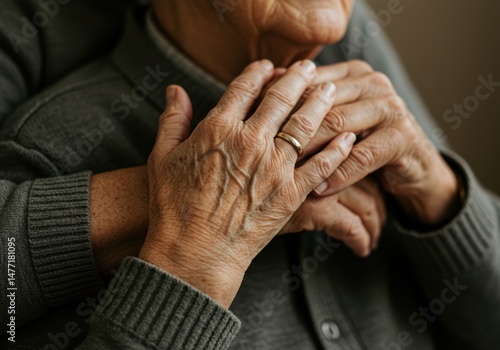 Fototapeta premium Elderly couple embrace, Love connection, Affectionate hug, Warm portrait, Realistic hands, Touching moment