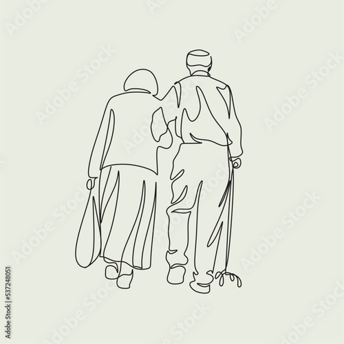 © Victoria, Obraz premium Elderly couple in continuous line art drawing style. Senior man and woman walking together holding hands. Minimalist black linear sketch isolated on white background. Vector illustration