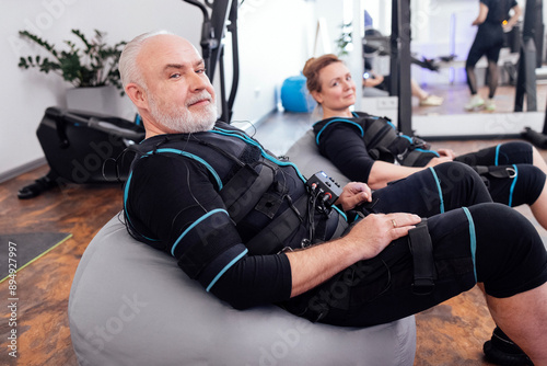 Obraz premium Elderly couple sits on massage chairs while waiting for ems workout in gym or fitness club.