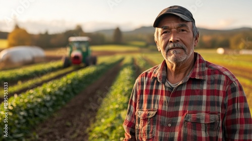 © Sirat, Obraz premium Elderly Farmer in Plaid Shirt Standing Confidently in Green Field with Tractor in Background During Golden Hour at Rural Farm Landscape