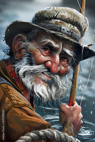 Obraz premium Elderly Fisherman with Hat by the Waterside Art