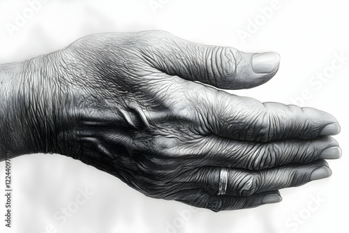 © Lailatul, Fototapeta premium Elderly hand, open palm, wrinkles, ring, white background; stock photo for aging, care, and compassion