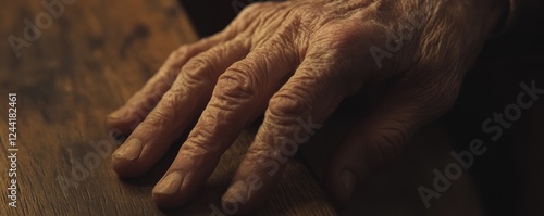 Fototapeta premium Elderly hand rests on wood; dark background; aging, care concept