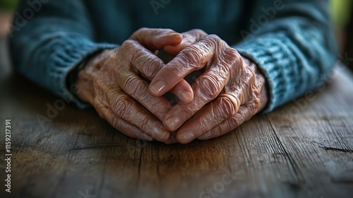 Fototapeta premium 2. Elderly hands and youthful hands clasped together on a wooden table with natural light