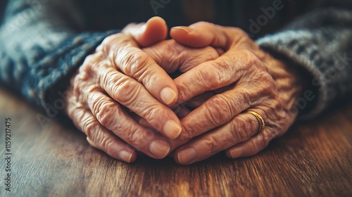 Fototapeta premium 2. Elderly hands and youthful hands clasped together on a wooden table with natural light