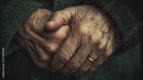 Fototapeta premium Elderly hands clasped together, showcasing the beauty of age and wisdom in a...