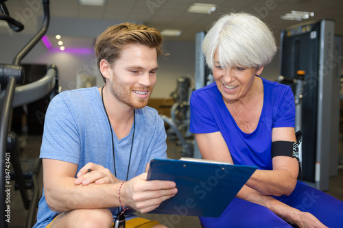 © auremar, Obraz premium elderly lady working out with friendly young male trainer