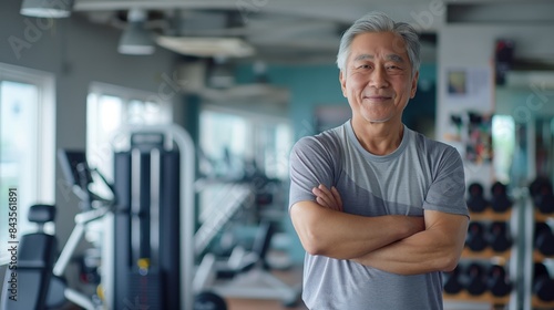 Obraz premium Elderly Male Korean Fitness Trainer in a Modern Gym, Promoting Active Seniors Lifestyle and Physical Wellness