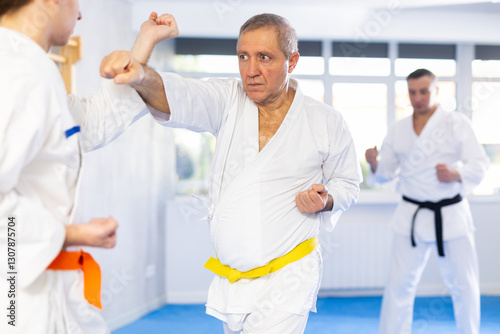 © JackF, Obraz premium Elderly man and young man in kimono practicing karate techniques in gym