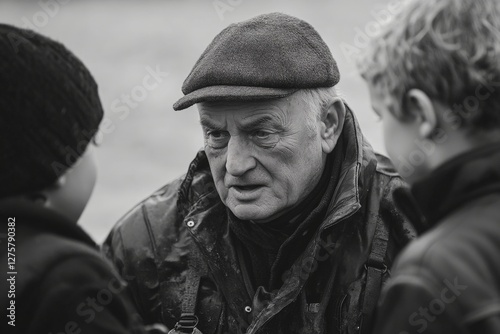 © ChaoticMind, Fototapeta premium Elderly man engages in conversation with two children outdoors in black and white setting during overcast weather