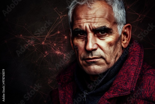 Fototapeta premium Elderly man in deep thought surrounded by dark red neural patterns...