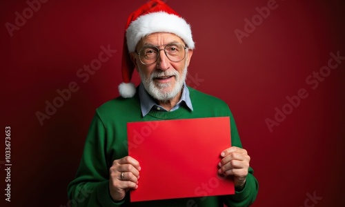 © Vitalii, Naklejka premium Elderly man in glasses and red Christmas sweater and Santa hat with red empty sheet in his hands on red background