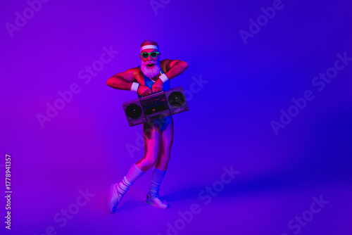 Naklejka premium Elderly man in retro gym outfit with boombox under purple blue neon lights posing for a fitness themed stock image
