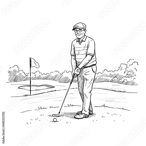 © Dana, Naklejka premium Elderly man preparing to hit golf ball near green