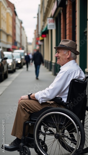 © Pixel Matrix, Obraz premium Elderly man seated in wheelchair along sidewalk