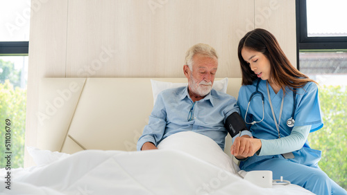 © kelvn, Obraz premium Elderly man sitting in bed while doctor or nurse checking his pulse.