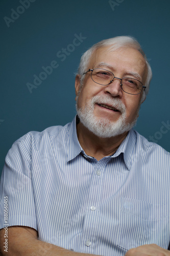 © mira_y, Obraz premium Elderly man smiles while sitting against a blue wall in a bright room during daytime