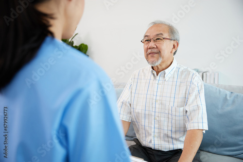 © offsuperphoto, Fototapeta premium elderly man smiling and talking with caregiver on sofa