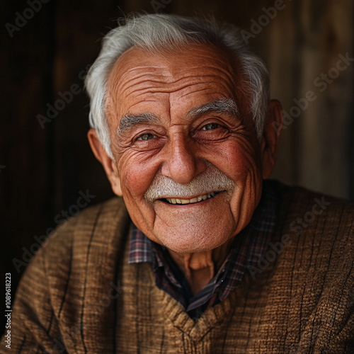 © Bohdan, Obraz premium Elderly man smiling warmly in a rustic setting with soft lighting