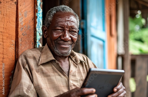 © Ratko, Naklejka premium Elderly man smiling while using a tablet at home