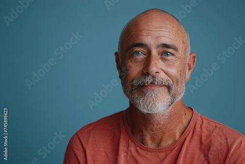 Obraz premium Elderly man with bald head and beard in red t-shirt smiling