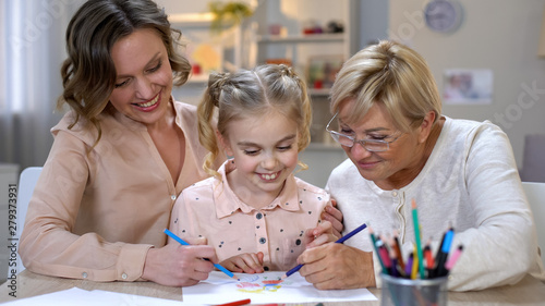 Fototapeta premium Elderly mother, daughter and grandchild drawing by color pencils, time together