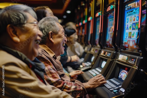 Obraz premium Elderly people happily playing slot machines in a lively casino, capturing...