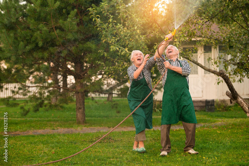 Fototapeta premium Elderly people having fun. Cheerful couple with garden hose.