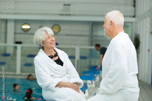 Obraz premium elderly people talking casual next to swimming pool