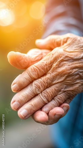 © Jiraphiphat, Fototapeta premium Elderly person with arthritis rubbing their hands, chronic pain, agerelated issues