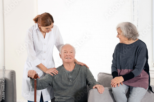 Fototapeta premium Elderly spouses with female caregiver in living room