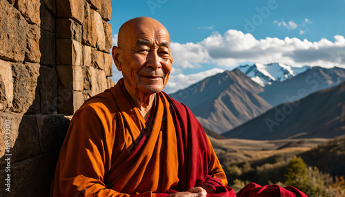 Naklejka premium Elderly Tibetan Monk Meditating in Saffron Robes
