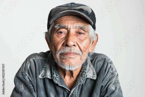 © Serhii, Fototapeta premium Elderly White Background. Portrait of Senior Hispanic Man Against White Background