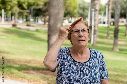 Obraz premium Elderly woman combs her hair in a sunny green park
