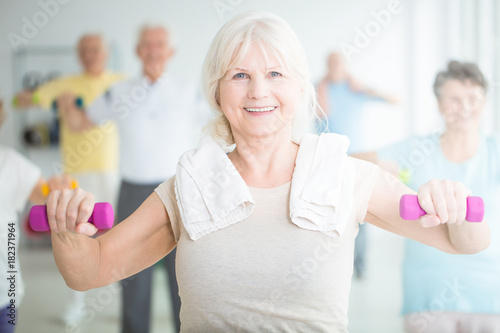 Fototapeta premium Elderly woman exercising with dumbbells