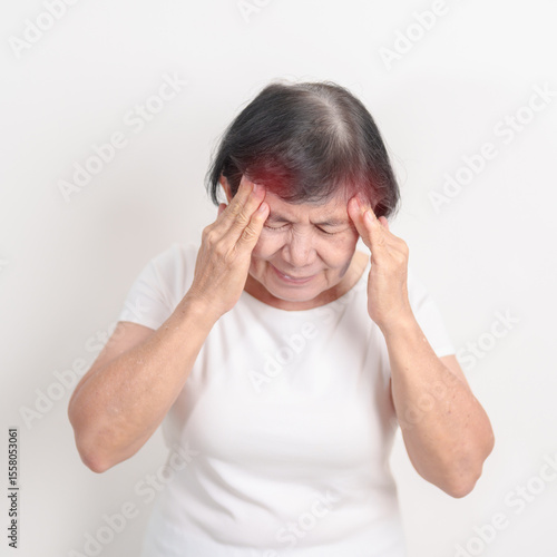 © Jo Panuwat D, Naklejka premium Elderly Woman having headache and Dizzy for concepts of Chronic Stress, Headache and Migraine, World Brain Tumor day, Brain Cancer, Brain Stroke, Dementia, alzheimer, Hypotension and mental health