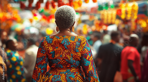 © whitestorm, Fototapeta premium Elderly woman in colorful African attire walks through a vibrant market during a lively afternoon