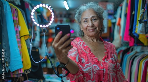 © Lens Legacy, Obraz premium Elderly woman in red taking a selfie with a smartphone, smiling inside a colorful clothing store, showcasing a LED ring light and various outfits and textiles.