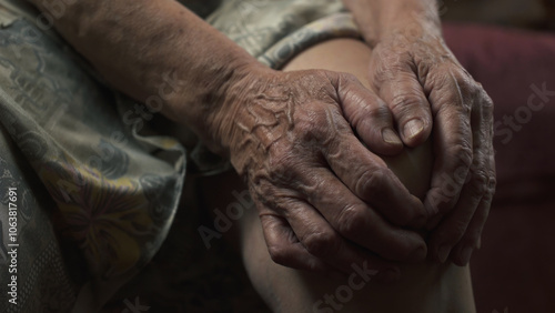 © diablosiatr, Fototapeta premium Elderly woman massaging her knee while sitting on sofa. Hand close-up.