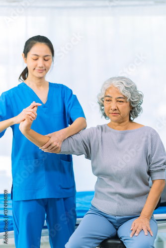 © ArLawKa, Obraz premium Elderly woman receives medical services from home care nurse while performing muscle strengthening exercises.