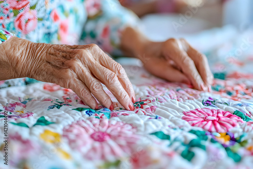 Fototapeta premium Elderly Woman's Hands Quilting a Floral Fabric