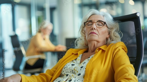 © mashimara, Obraz premium Elderly woman sleeping in an office chair, looking peaceful and relaxed. Ideal for content on senior lifestyle, workplace dynamics, and health in digital marketing and editorial.