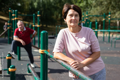 © caftor, Fototapeta premium Elderly woman stands in a sports bar on an outdoor sports field