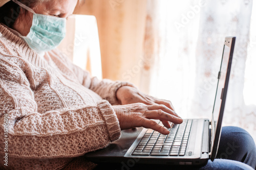 Fototapeta premium Elderly woman wearing a medical mask using her laptop, typing something.