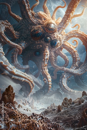 Fototapeta premium Eldritch Being in Alien Landscape: A Journey into the Cosmic Horrors Style of Digital Art