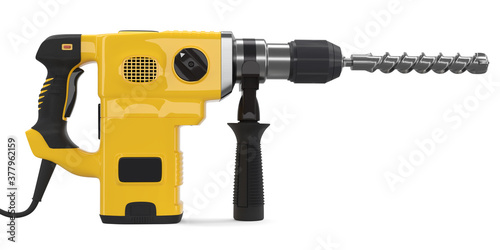 © boule1301, Fototapeta premium Electric drill with cord and attached metal bit, tool for repair