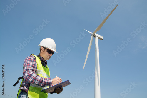 Fototapeta premium Electric Engineer writing report on Clipboard with Wind turbine power Generator