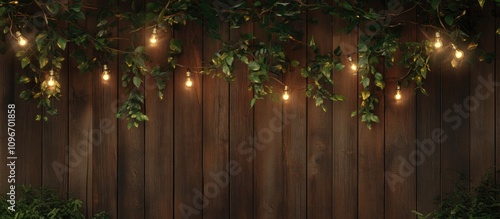 Fototapeta premium Electric garland with warm lights and greenery on rustic wooden background creating a cozy and inviting ambiance for events and decor.