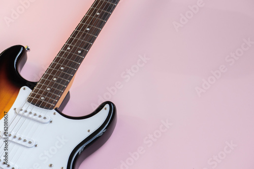 © Inga Av, Obraz premium Electric guitar, headphones on the pink background.